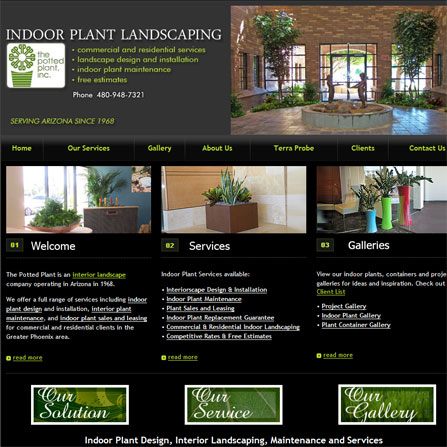 Custom website design to allow a local plant maintenance company to market their services and products. The site incorporates photo galleries of plants, containers, and completed indoor landscape designs, and a contact form to easily allow their potential clients to contact them.